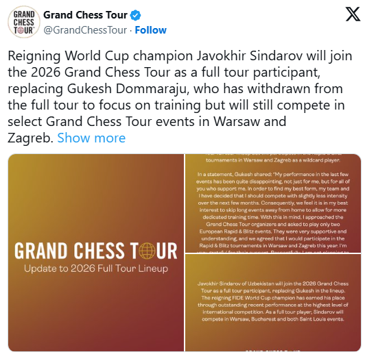 Die Grand Chess Tour gab Gukeshs Entscheidung auf X bekannt.