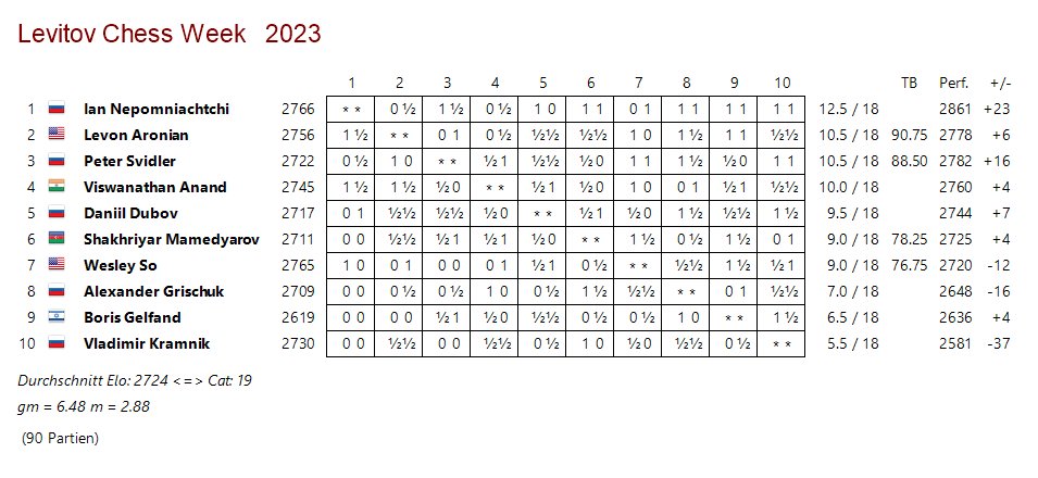 Somit fiel der Turniersieg der 2. Levitov Chess Week an den überragenden Ian Nepomniachtchi, zum zweiten Mal, denn auch vor vier Jahren bei der Erstauflage hatte Nepomniachtchi das Turnier gewonnen.