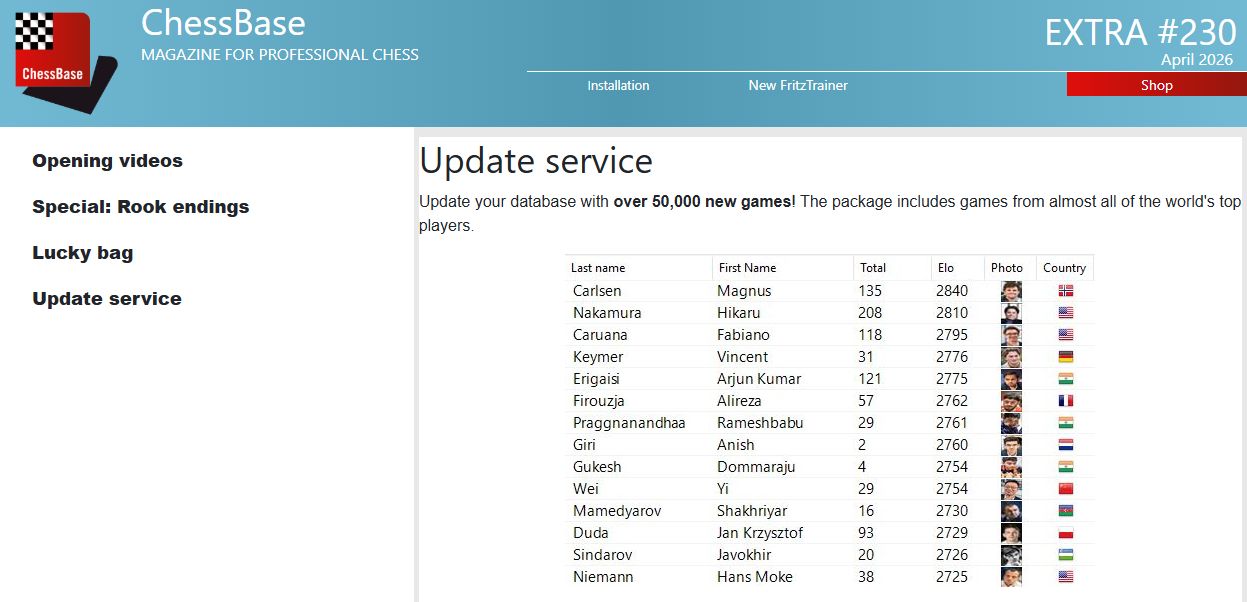 Die Partien des Update-Service sind auch im Mega-Update-Service 2026 enthalten, den man mit einem aktuellen ChessBase-Programm (und einem entsprechenden Abonnement) nutzen kann.
