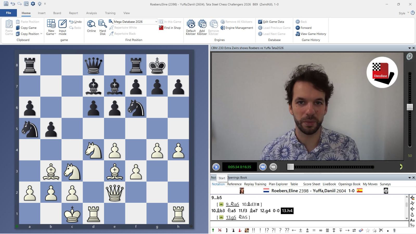Eline Roebers hatte im Challengers-Turnier von Wijk aan Zee Anfang dieses Jahres einen schweren Stand. Nach den ersten vier Runden lag sie mit null Punkten am Ende des Klassements. Doch dann gelang ihr gegen einen der Elofavoriten ihrer Gruppe, Daniil Yuffa, ein Angriffssieg in dem für sie so typischen Stil. Im Klassischen Sizilianer setzte die junge Niederländerin auf das zunehmend populärere 6.Lc4 und initiierte anschließend mit 0-0-0, f3, g4 und h4 den Englischen Angriff. In der entscheidenden Phase nutzte sie mit 24.h6 gxh6 25.g6 Txe7 26.g7+ ein starkes taktisches Motiv, mit dem sie nicht nur eine Qualität gewann, sondern zudem den gegnerischen König entscheidend schwächte.