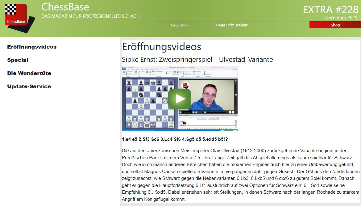 Vor über 80 Jahren wurde diese Variante vom Amerikaner Olav Ulvestad entwickelt, doch lange galt sie für Schwarz als kaum spielbar. Mit den modernen Engines setzte jedoch auch hier ein Umdenken ein. GM Sipke Ernst bringt in seiner Videoanalyse sowohl die Nebenvarianten 6.Lb3, 6.Lxb5 und 6.dxc6 als auch die Hauptfortsetzung 6.Lf1 auf den neuesten Stand.