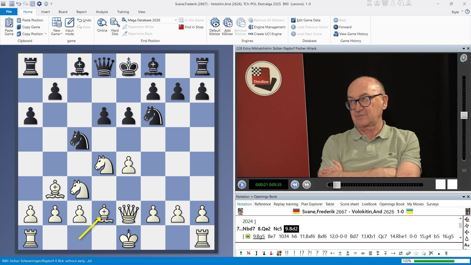 6.Lc4 war eine der Lieblingswaffen Bobby Fischers gegen die Najdorf-Variante. Weiß will anschließend durch das Vorrücken des f-Bauern den „Fischer-Angriff“ durchführen. Mikhalchishin zeigt eine moderne Behandlung dieser Idee von Frederik Svane gegen Andrei Volokitin (2025): Nach 6…e6 7.Lb3 Sbd7 setzte er mit 8.De2 Sc5 9.Ld2 und der Absicht sofort lang zu rochieren fort. Erst danach setzte er seine Bauern am Königsflügel in Bewegung. „Probably, the Fischer Attack is alive!“