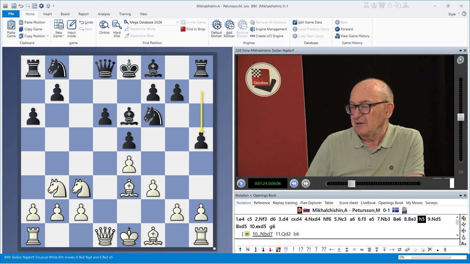 Mit dem modernen Zug 8…h5 unterbindet Schwarz den thematischen weißen Vorstoß g2-g4 und lenkt das Spiel in eher positionelle Bahnen. Mikhalchishin selbst hatte diese Variante gegen Margeir Petursson (Lviv 2025) auf dem Brett. In der Partie entschied sich sein Gegner für die Fortsetzung 10….g6, was Mikhalchishin nach 11.Dd2 Sbd7 12.0-0-0 Sb6 mit dem positionellen Bauernopfer 13.c4 beantwortete – ein Opfer, das Dominguez Perez bereits vor Jahren zweimal anwandte. „In my opinion, it is not yet tested sufficiently!“