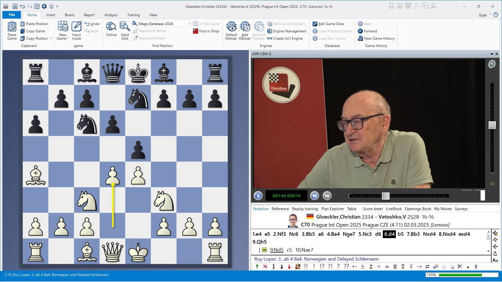 „Everybody nowadays sacrifices a pawn”. Das tat auch das junge deutsche Talent Christian Glöckler beim Prague Open 2025 gegen GM V. Vetoshko in der Spanischen Nebenvariante mit 4…Sge7. Aber hat das mit 6.d4 eingeleitete Opfer auch einen Wert? Mikhalchishin untersucht nach 8…exd4 die weißen Optionen 9.Sd5, 9.Df3 und 9.Dh5 und findet für Weiß allenfalls etwas Kompensation für den Bauern.
