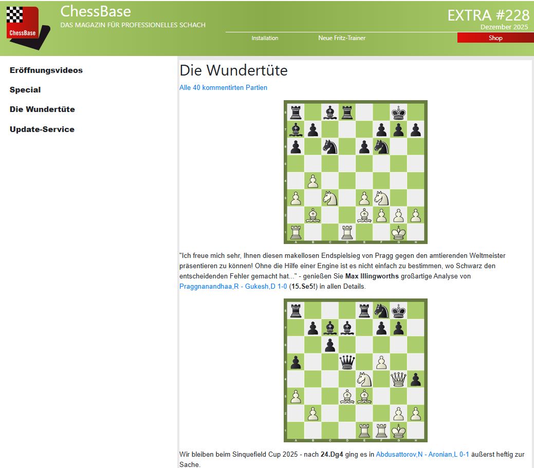 Das Extra #228 liefert in der „Wundertüte“ 40 kommentierte Partien aus verschiedensten Turnieren.