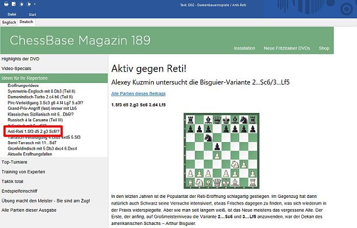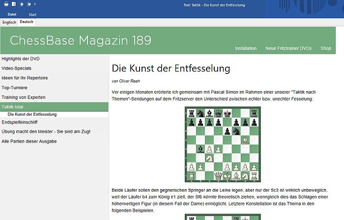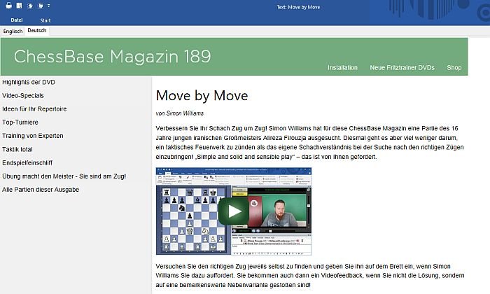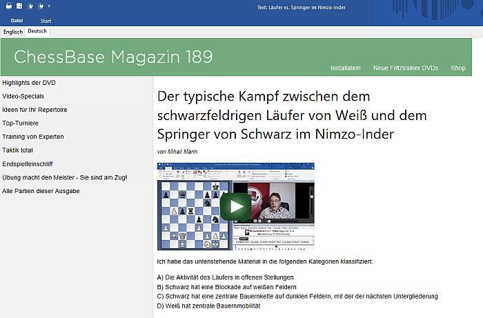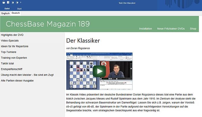 Oliver Reehs Beitrag besteht aus 26 Partien mit vielen Trainingsfragen und einem Einleitungstext mit Links zu allen Partien. Dazu kommen drei Videos im interaktiven Format.