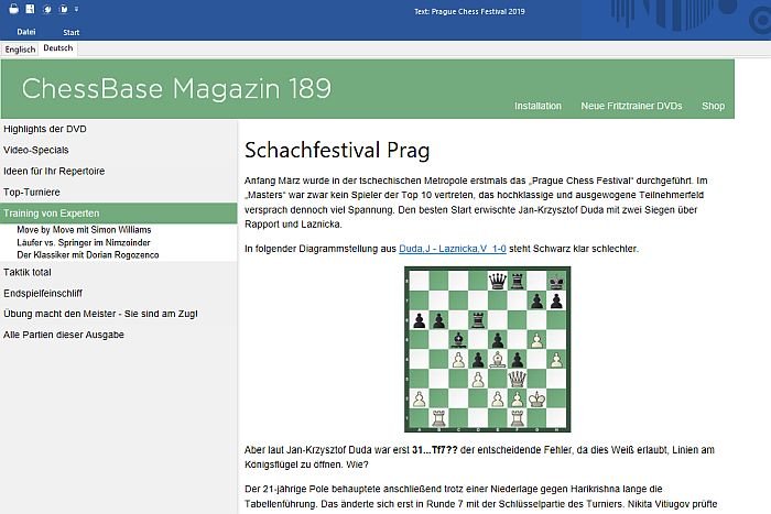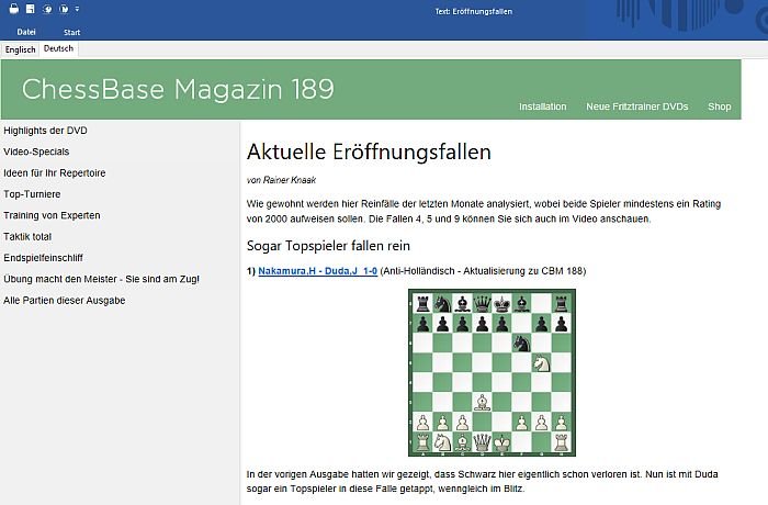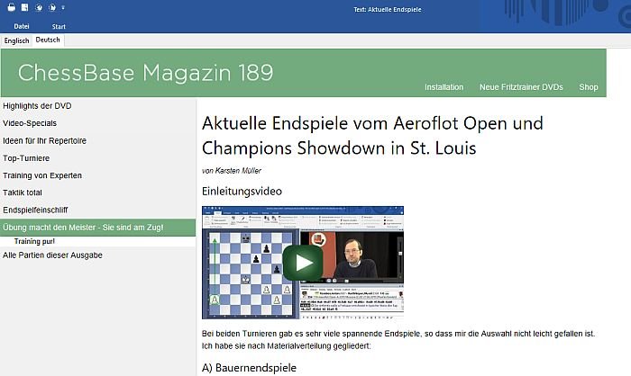Karsten Müllers Endspielbeitrag ist einmal mehr weit gefächert. Seine Zusammenstellung aktueller Endspiele umfasst einen Einleitungstext inkl. eines Videos. Zusätzlich hat der Endspielexperte vier Videos aufgenommen (zwei davon im interaktiven Format) und beantwortet Fragen der Leser.