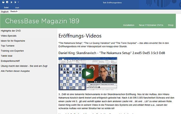 Drei klangvolle Videobeiträge erwarten Sie: „The Nakamura Setup“, „The Le Quang Variation“ und „The Torre Surprise“. U.a. weiht Sie Daniel King in die Finessen des Skandinavisch-Aufbaus ein, den Hikaru Nakamura kürzlich in der Variante mit 3...Dd8 kreiert hat!