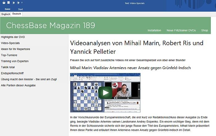 Freuen Sie sich auf fünf zusätzliche Videos! Mihail Marin zeigt eine Partie des neuen Europameisters Vladislav Artemiev. Yannick Pelletier präsentiert seine Najdorf-Auslese vom Gibraltar-Open. Und Robert Ris gibt die Parole aus: „Everything depends on concrete things!“