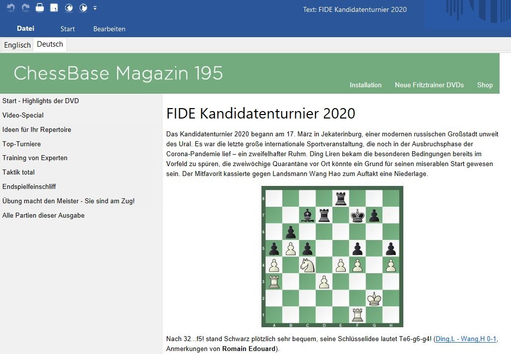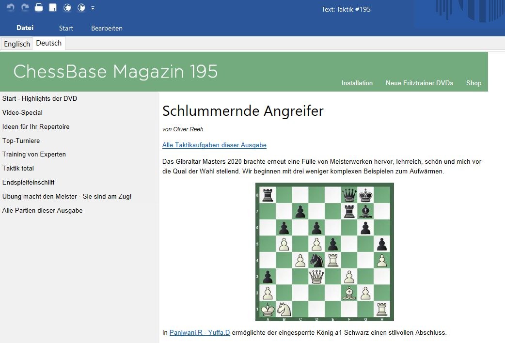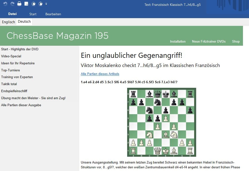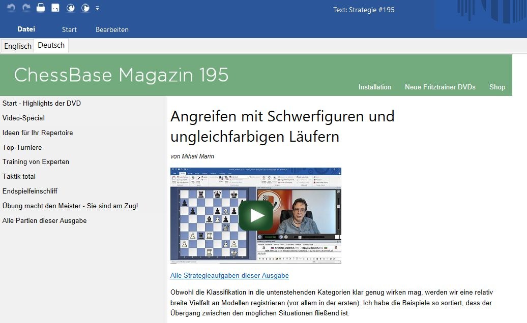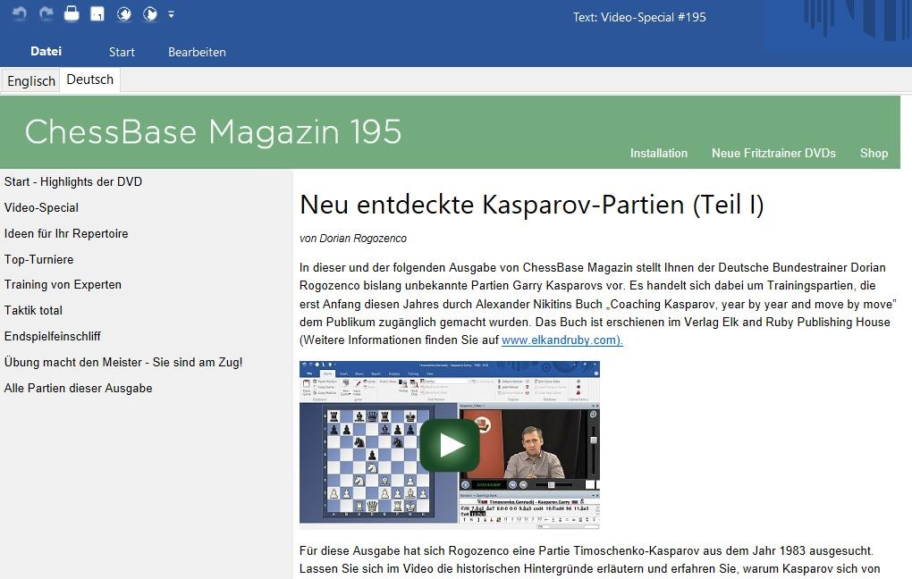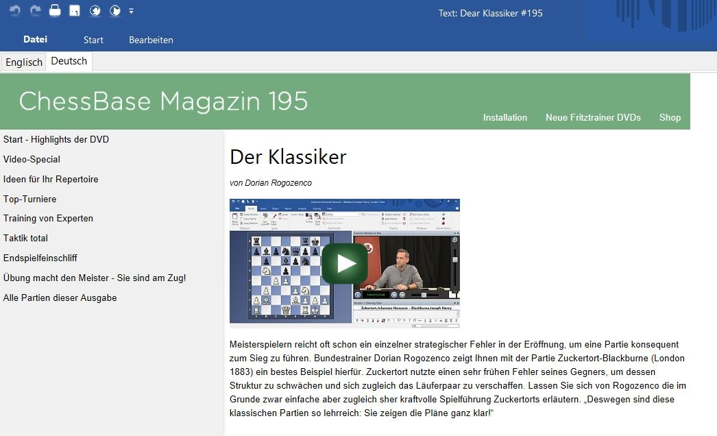 ChessBase Magazin ist das umfangreichste und anspruchsvollste Schachmagazin überhaupt. Weltklassespieler analysieren ihre Glanzpartien und erklären Ihnen die Ideen hinter den Zügen. Eröffnungsspezialisten präsentieren die neuesten Trends in der Eröffnungstheorie und spannende Ideen für Ihr Repertoire. Meistertrainer in Sachen Taktik, Strategie und Endspiel zeigen Ihnen genau die Tricks und Techniken, die man als erfolgreicher Turnierspieler braucht! DVD mit mehreren Stunden Videospielzeit + Begleitheft.