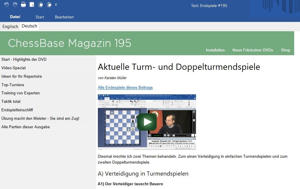 Karsten Müller beschäftigt sich in dieser Ausgabe mit zwei wichtigen Endspielthemen: Zum einen steht die Verteidigung in einfachen Turmendspielen auf dem Trainingsplan und zum anderen wichtige Faustregeln in Doppelturmendspielen. Zusätzlich liefert der Hamburger Endspielexperte drei Videoanalysen zu aktuellen Meisterpartien und geht auf verschiedene Leserbriefe ein.