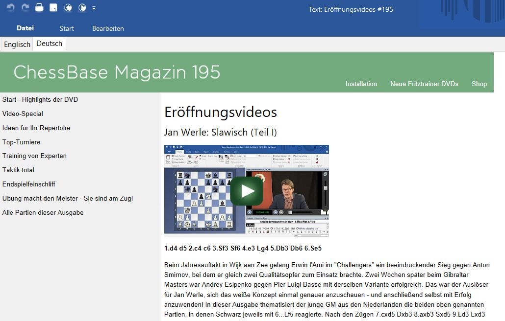 Drei aktuelle Videobeiträge erwarten Sie: Jan Werle stellt ein neues Konzept von Erwin l'Ami vor, das in Wijk aan Zee für Aufsehen sorgte. Daniel King präsentiert einen aggressiven Katalanen, und Mihail Marin nimmt Caruanas Idee gegen Spanisch vom Kandidatenturnier unter die Lupe.