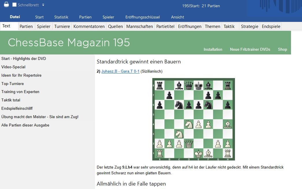 Der direkteste Weg, eine Partie zu gewinnen, ist den Gegner in einer vorbereitete Falle zu locken. Fallenexperte Rainer Knaak präsentiert acht Fallen aus der aktuellen Turnierpraxis, drei davon im Video-Format.