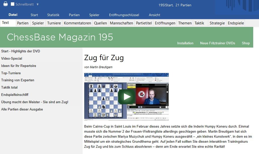Verbessern Sie Ihr Schach "Zug für Zug"! Martin Breutigam hat für diese Ausgabe die Partie zwischen Mariya Muzychuk und Humpy Koneru vom Cairns Cup ausgewählt – „ein kleines Kunstwerk“! Und Simon Williams geht mit Ihnen in "Move by Move" eine ältere Partie von Maxime Vachier-Lagrave durch, in der eine der Hauptstärken der französischen Nummer eins sehr gut sichtbar wird: Das Potential der eigenen Figuren optimal auszuschöpfen. Können Sie das auch?
