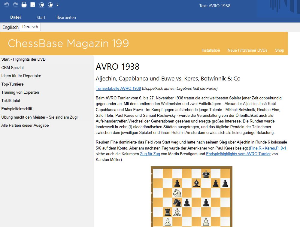 Martin Breutigam wählt diesmal für seine interaktive Trainingskolumne einen Klassiker aus dem AVRO-Turnier: die Partie Reuben Fine gegen Paul Keres. Das Spiel des damals 22 Jahre jungen Keres wirkt heute noch enorm tiefgründig und lehrreich; in allen Partiephasen überrascht der Este mit strategischen, taktischen oder technischen Feinheiten. Versuchen Sie wie seinezeit Keres eine Initative mit einfachen Mitteln erst auf- und dann auszubauen! Und Simon Williams geht mit Ihnen "Move by Move" die Partie Aljechins gegen Capablanca vom AVRO-Turnier duirch. Übernehmen Sie die Initiative auf beiden Flügeln des Brettes und schnüren Sie das Spiel des Gegners mit jedem Zug weiter ein.