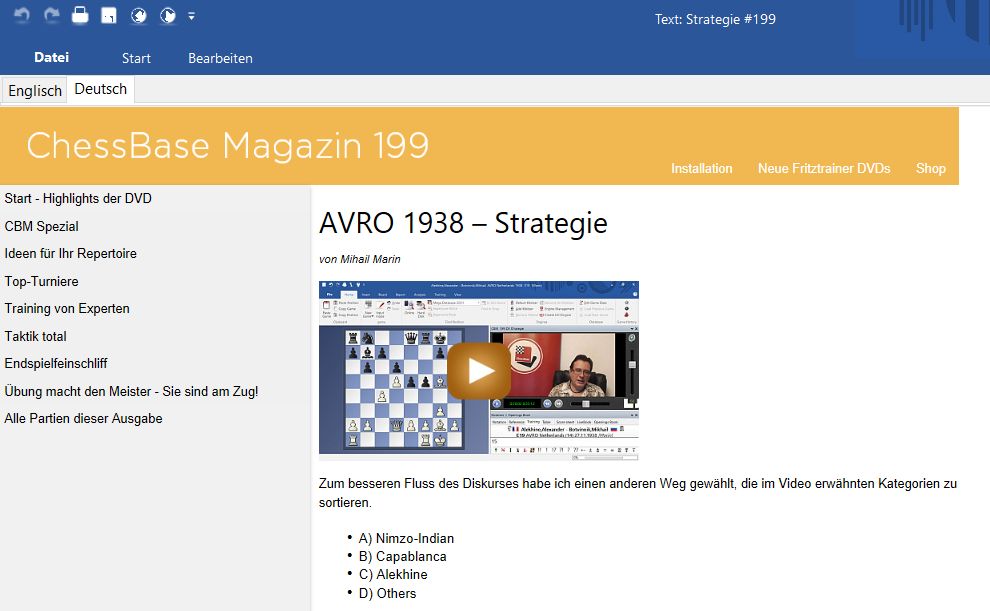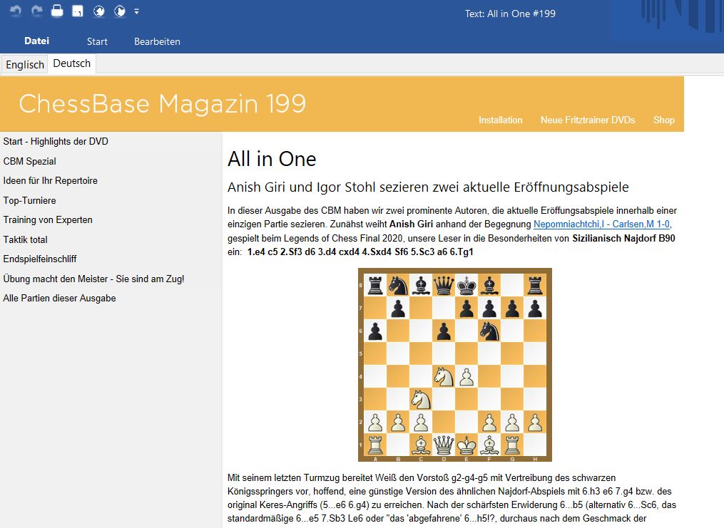 Spezial: Themenschwerpunkt AVRO 1938. "All in One": Anish Giri und Igor Stohl sezieren zwei topaktuelle Eröffnungsabspiele. Analysen von Duda, Firouzja, Nielsen u.a. Videos von Erwin l'Ami, Daniel King und Mihail Marin. 11 Eröffnungsartikel u.v.m.