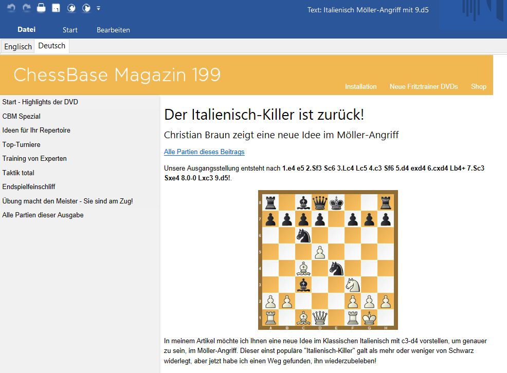 Christian Braun: Italienisch Möller-Angriff 3.Lc4 Lc5 4.c3 Sf6 5.d4 exd4 6.cxd4 Lb4 + 7.Sc3 Sxe4 8.0–0