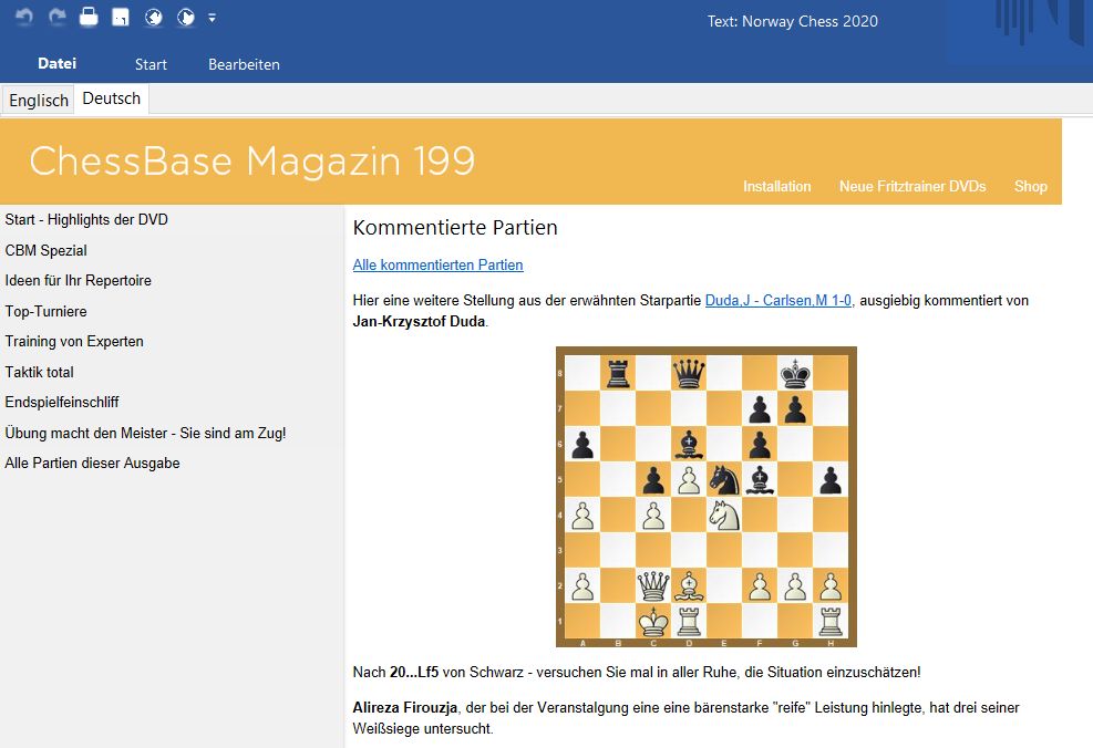 Nicht weniger als vier Artikel steuert Karsten Müller zu dieser Ausgabe bei. Allen voran eine Zusammenstellung der Höhepunkte vom AVRO-Turnier 1938 und vom Norway Chess 2020. Dazu gibt es eine Trainingseinheit "Aktuelle Bauernendspiele" und eine reichhaltige Präsentation der "Leserbriefe".