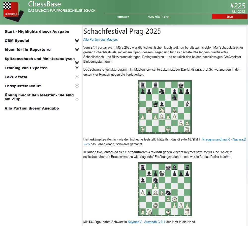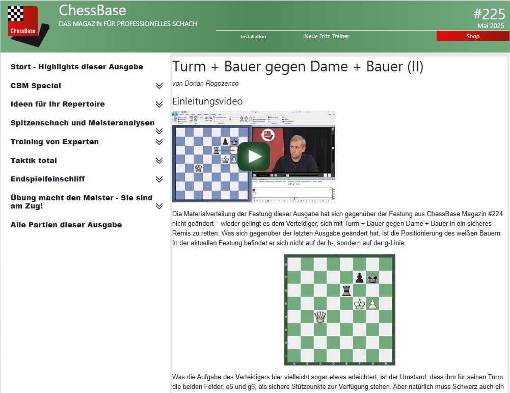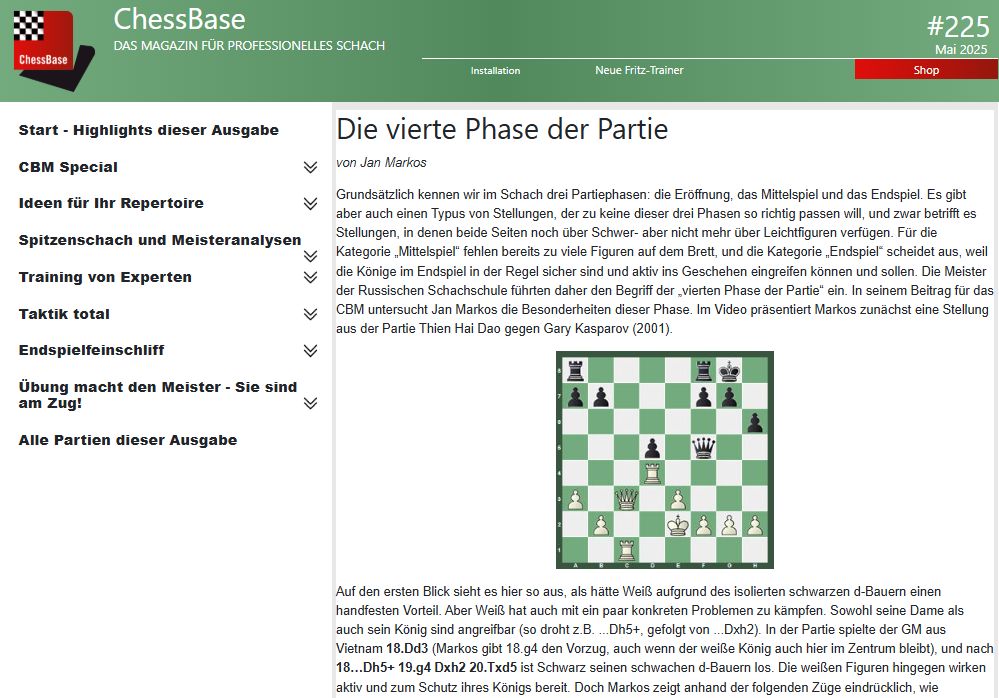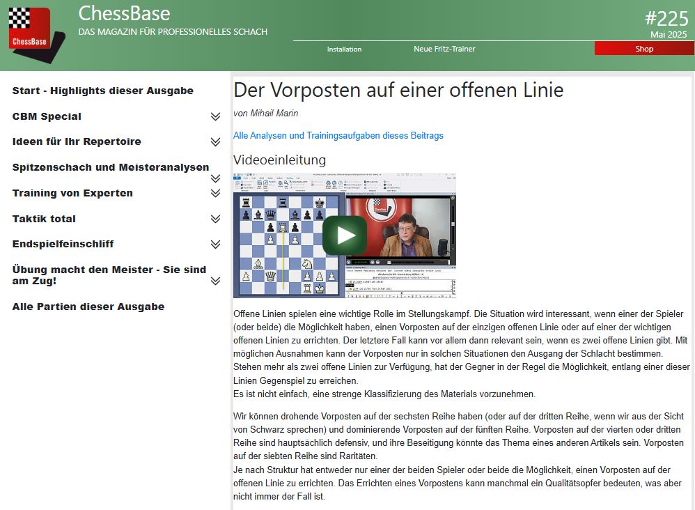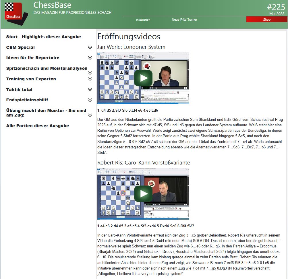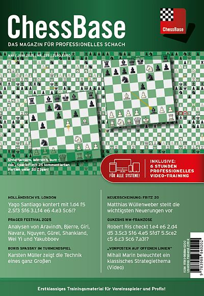Vom Schachfestival Prag 2025 über Jan Werles Eröffnungsvideo zum Londoner System und das "Special" mit 27 höchst unterhaltsamen Miniaturen und Mihail Marins Strategiebeitrag "Vorposten auf offenen Linien" bis zu Dr. Karsten Müllers Videoreihe "Endspiel Basiswissen".