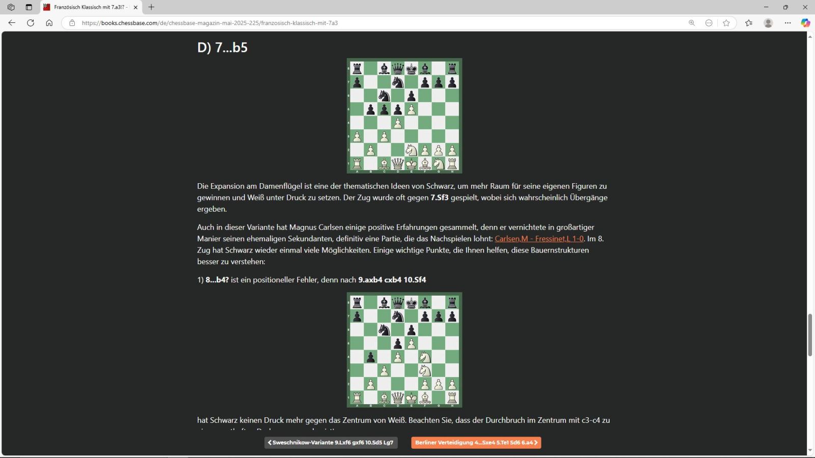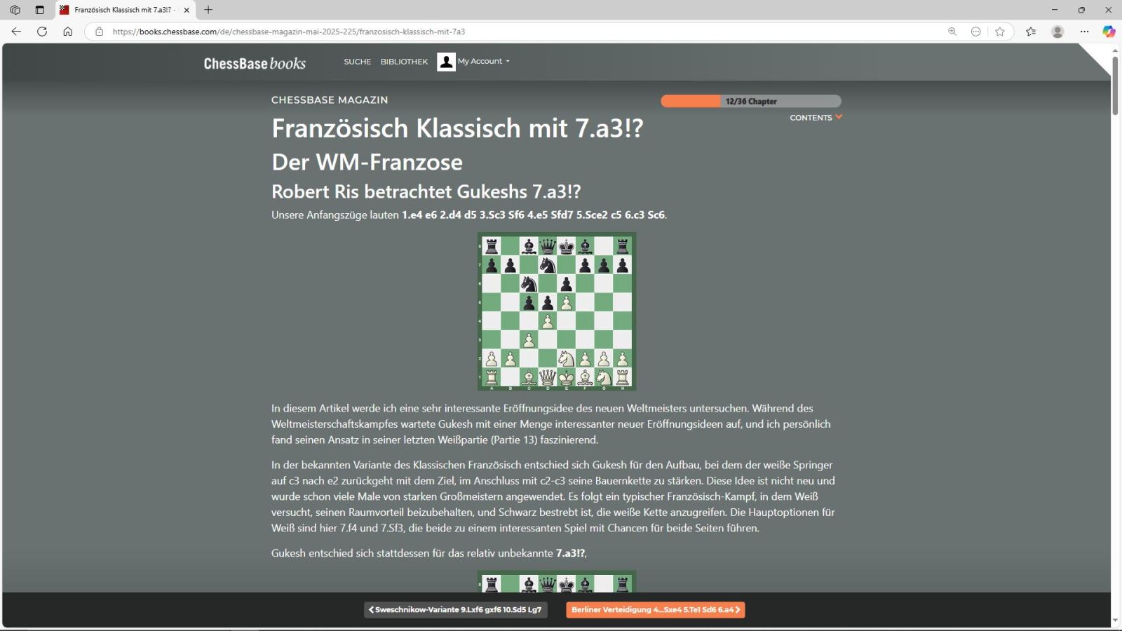 "In der bekannten Variante des Klassischen Französisch entschied sich Gukesh für den Aufbau, bei dem der weiße Springer auf c3 nach e2 zurückgeht mit dem Ziel, im Anschluss mit c2-c3 seine Bauernkette zu stärken. Diese Idee ist nicht neu und wurde schon viele Male von starken Großmeistern angewendet. Es folgt ein typischer Französisch-Kampf, in dem Weiß versucht, seinen Raumvorteil beizubehalten, und Schwarz bestrebt ist, die weiße Kette anzugreifen. Die Hauptoptionen für Weiß sind hier 7.f4 und 7.Sf3, die beide zu einem interessanten Spiel mit Chancen für beide Seiten führen.