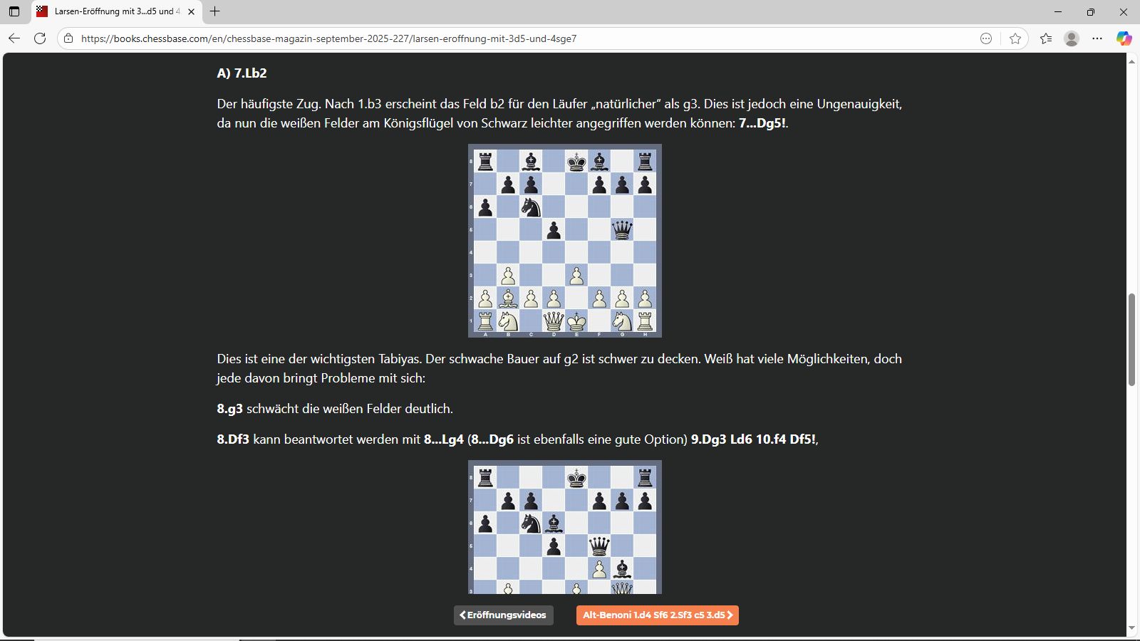 Über 7 Stunden Video-Spielzeit mit Felix Blohberger, Martin Breutigam, Luis Engel Jan Markos, Mihail Marin, Dr. Karsten Müller, Michael Prusikin, Oliver Reeh, Robert Ris, Dorian Rogozenco und Ivan Sokolov – Biel 2025: Analysen von Aravindh, Dardha, Ma Qun, Hakobyan, Jumabayev, Navara, Theodorou und Wojtaszek – Perfektes Angriffsspiel: Dorian Rogozenco zeigt den „Modernen Klassiker“ Kasparov vs. Kramnik (Novgorod 1994), in der der Weltmeister in der Sweschnikow-Variante ein neues Konzept mit 15.Dd2 und langer Rochade anwandte – Aggressiver Sizilianer: Yago Santiago agiert mit 1.e4 c5 2.Sf3 e6 3.d4 cxd4 4.Sxd4 Sc6 5.Sc3 Lc5!? auf den schwarzen Feldern – Eröffnungstrends im Video: Sizilianisch Drachen-Variante, Slawische Verteidigung und Sizilianisch Najdorf-Variante – Endspiel-Basiswissen Dame + Bauer gegen Dame: Eine Materialkonstellation, die genaueste Technik erfordert, detailliert erklärt von Karsten Müller u.v.m.