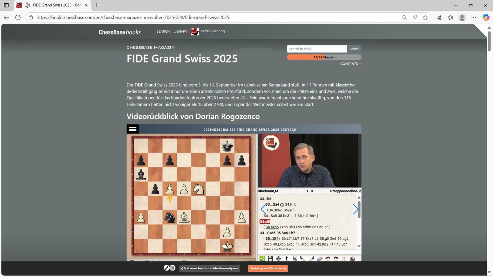 Über 7 Stunden Video-Spielzeit mit Felix Blohberger, Martin Breutigam, Rustam Kasimdzhanov, Jan Markos, Mihail Marin, Dr. Karsten Müller, Michael Prusikin, Oliver Reeh, Robert Ris, Dorian Rogozenco und Ivan Sokolov – FIDE Grand Swiss 2025: Analysen von Giri, Blübaum, Vaishali, Abdusattorov, Mishra, Vidit u.v.a. – Die Doppelblockade: Mihail Marin beleuchtet Szenarien, in denen es vorteilhaft ist, Freibauern durch Springer und Läufer zu hemmen – Action im Nimzoinder: Balázs Csonka prüft 1.d4 Sf6 2.c4 e6 3.Sc3 Lb4 4.Dc2 0-0 5.e4 d6 6.e5!? – Der Schlüsselverteidiger: In den „Praxistipps für Turnierspieler“ zeigt Jan Markos, wie man die wichtigste gegnerische Figur identifiziert und ausschaltet – All in One – im 3. Zug aus dem Buch: Romain Edouard war selbst verblüfft, wie gut 1.e4 e6 2.d4 d5 3.Sd2 e5!? Funktioniert u.v.m.