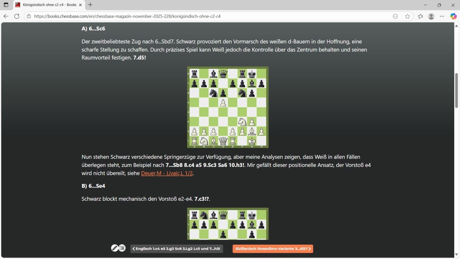 Über 7 Stunden Video-Spielzeit mit Felix Blohberger, Martin Breutigam, Rustam Kasimdzhanov, Jan Markos, Mihail Marin, Dr. Karsten Müller, Michael Prusikin, Oliver Reeh, Robert Ris, Dorian Rogozenco und Ivan Sokolov – FIDE Grand Swiss 2025: Analysen von Giri, Blübaum, Vaishali, Abdusattorov, Mishra, Vidit u.v.a. – Die Doppelblockade: Mihail Marin beleuchtet Szenarien, in denen es vorteilhaft ist, Freibauern durch Springer und Läufer zu hemmen – Action im Nimzoinder: Balázs Csonka prüft 1.d4 Sf6 2.c4 e6 3.Sc3 Lb4 4.Dc2 0-0 5.e4 d6 6.e5!? – Der Schlüsselverteidiger: In den „Praxistipps für Turnierspieler“ zeigt Jan Markos, wie man die wichtigste gegnerische Figur identifiziert und ausschaltet – All in One – im 3. Zug aus dem Buch: Romain Edouard war selbst verblüfft, wie gut 1.e4 e6 2.d4 d5 3.Sd2 e5!? Funktioniert u.v.m.