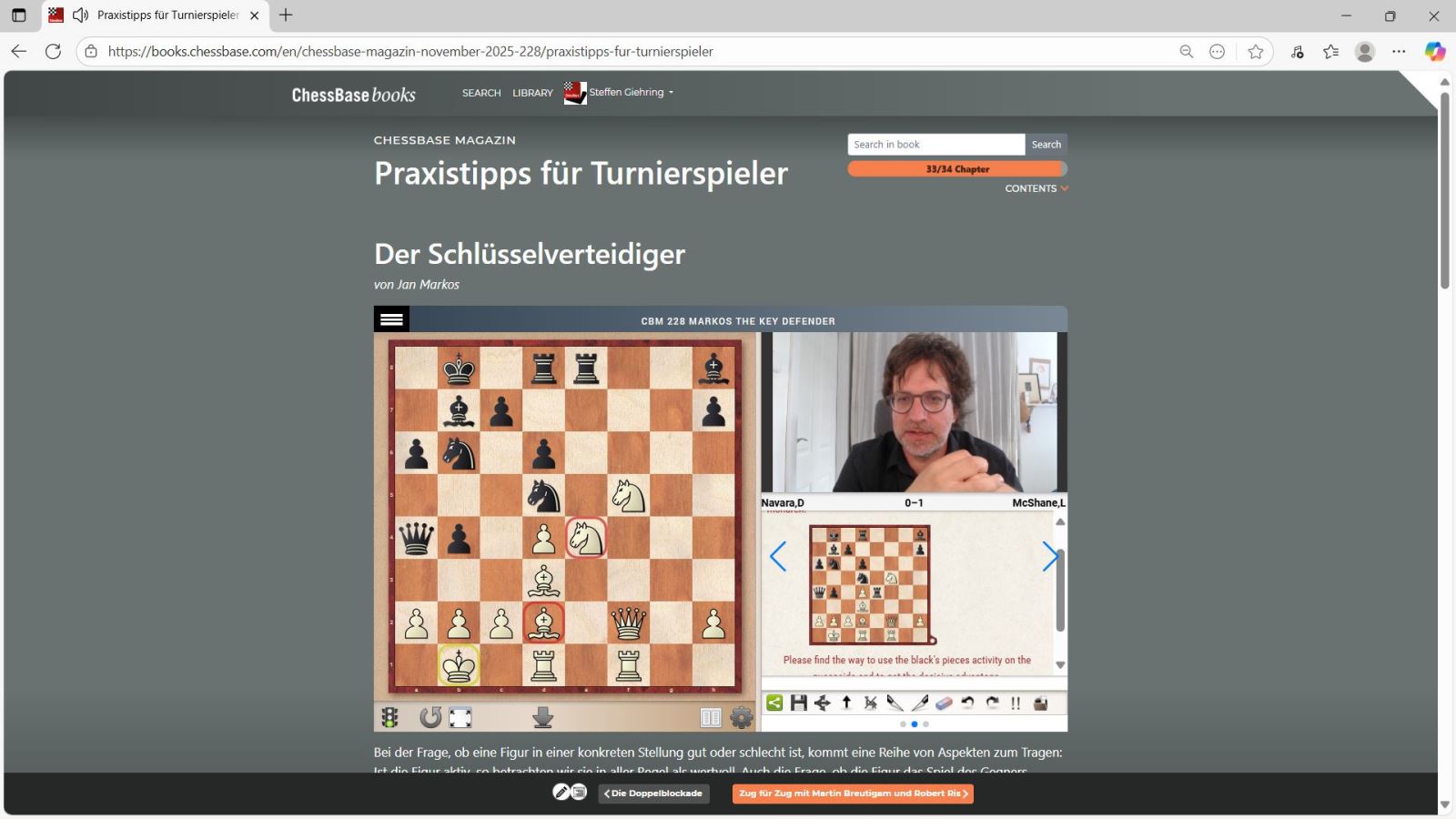Über 7 Stunden Video-Spielzeit mit Felix Blohberger, Martin Breutigam, Rustam Kasimdzhanov, Jan Markos, Mihail Marin, Dr. Karsten Müller, Michael Prusikin, Oliver Reeh, Robert Ris, Dorian Rogozenco und Ivan Sokolov – FIDE Grand Swiss 2025: Analysen von Giri, Blübaum, Vaishali, Abdusattorov, Mishra, Vidit u.v.a. – Die Doppelblockade: Mihail Marin beleuchtet Szenarien, in denen es vorteilhaft ist, Freibauern durch Springer und Läufer zu hemmen – Action im Nimzoinder: Balázs Csonka prüft 1.d4 Sf6 2.c4 e6 3.Sc3 Lb4 4.Dc2 0-0 5.e4 d6 6.e5!? – Der Schlüsselverteidiger: In den „Praxistipps für Turnierspieler“ zeigt Jan Markos, wie man die wichtigste gegnerische Figur identifiziert und ausschaltet – All in One – im 3. Zug aus dem Buch: Romain Edouard war selbst verblüfft, wie gut 1.e4 e6 2.d4 d5 3.Sd2 e5!? Funktioniert u.v.m.