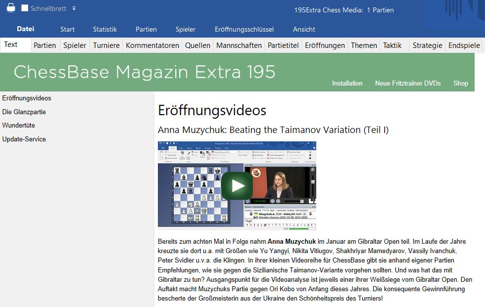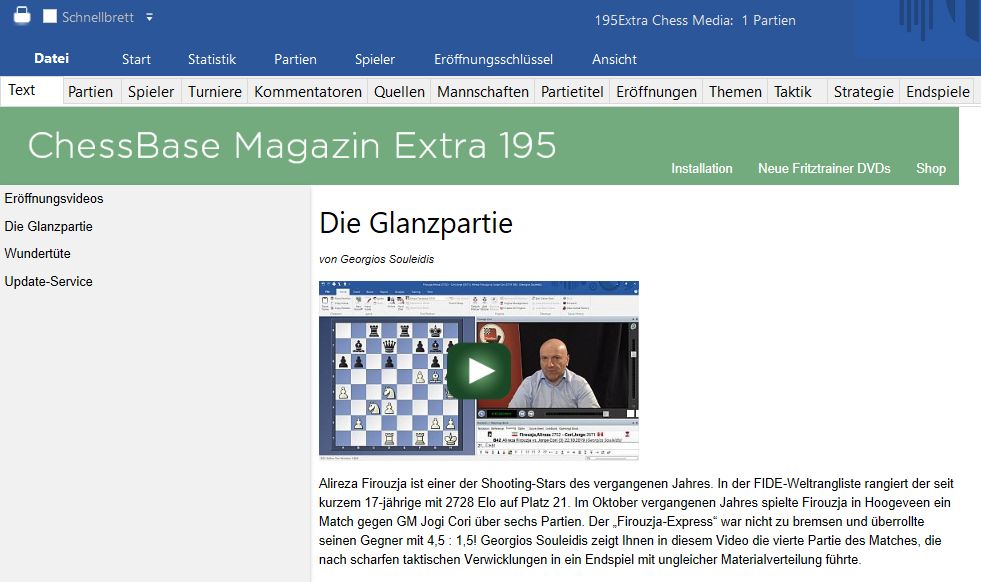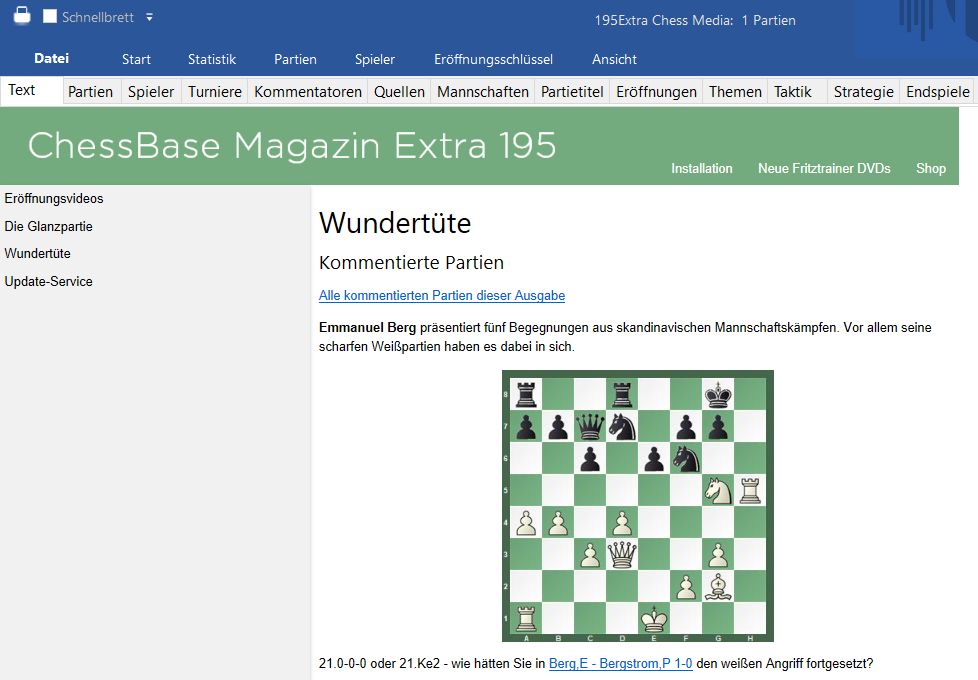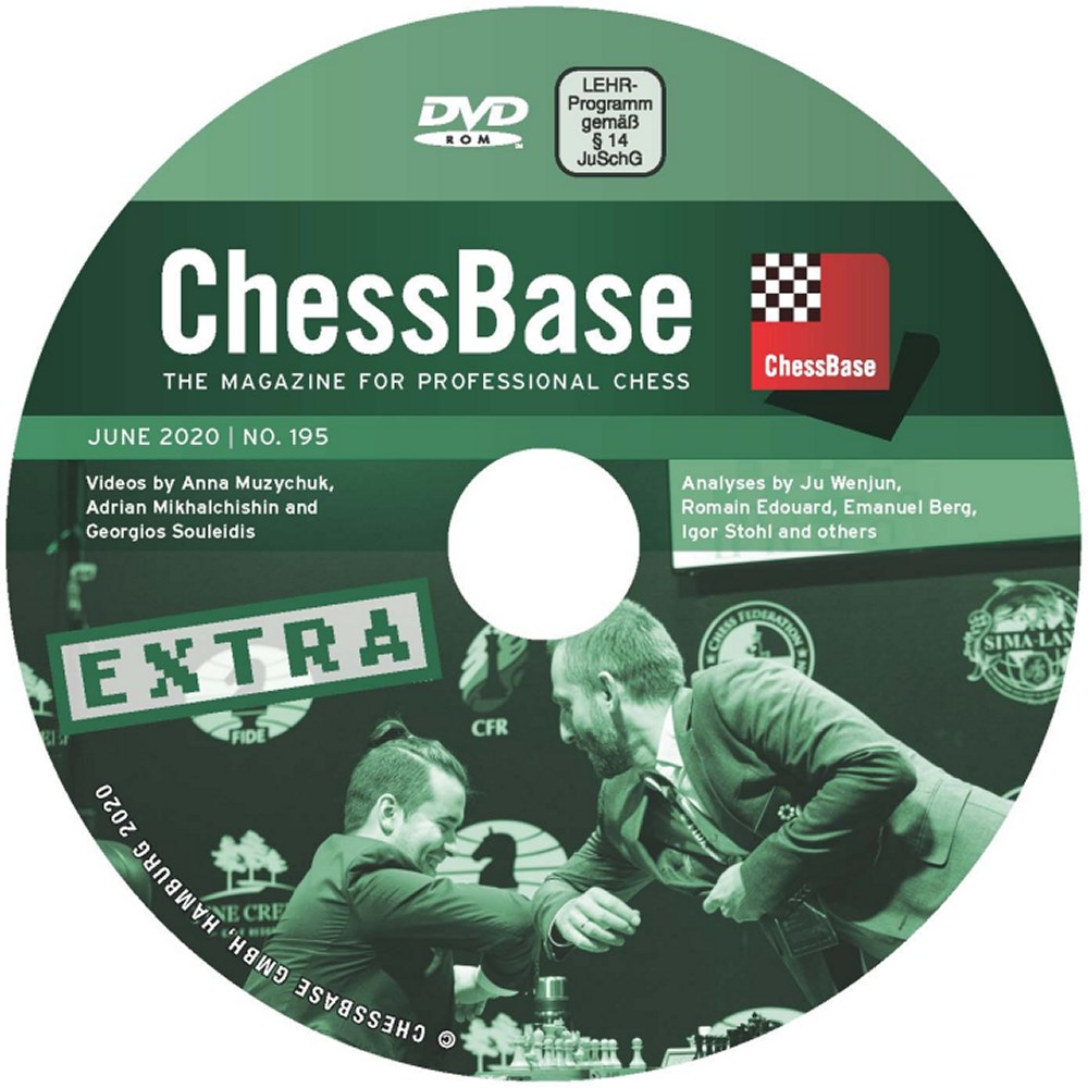 Das neue ChessBase Magazin Extra 195 enthält knapp eine Stunde Videotraining. Plus 23 ausführlich analysierte Partien von Autoren wie Ju Wenjun, Romain Edouard, Emanuel Berg, Igor Stohl u.a. Das ChessBase Magazin Extra ist die perfekte Ergänzung zum ChessBase Magazin und kann ebenfalls im Abonnement bezogen werden (6 Ausgaben pro Jahr). Lieferbar auf DVD oder als Download.