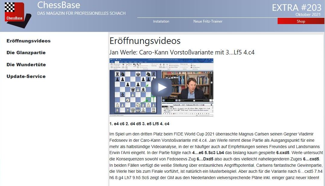 Beim FIDE World Cup überraschte Magnus Carlsen seinen Gegner Vladimir Fedoseev in der Caro-Kann Vorstoßvariante mit 4.c4. Jan Werle nimmt diese Partie als Ausgangspunkt für eine mehr als halbstündige Videoanalyse, In der Partie folgte nach 4…e6 5.Sc3 Lb4 das bislang kaum gespielte 6.cxd5. Werle untersucht die Konsequenzen sowohl von Fedoseevs 6…Dxd5 also auch des Zurückschlagens mit dem Bauern 6…cxd5.