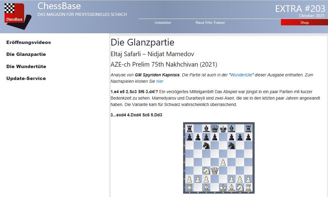 Die „Glanzpartie“ steuert diesmal Spyridon Kapnisis bei. Allerdings analysiert der GM aus Griechenland nicht eine eigene Partie, sondern die Begegnung zwischen Eltaj Safarli und Nidjat Mamedov von der Meisterschaft aus Aserbaidschan. Bereits der Auftakt zu dieser Angriffspartie ist bemerkenswert: Das verzögerte Mittelgambit mit 1.e4 e5 2.Sc3 Sf6 3.d4!? exd4 4.Dxd4 Sc6 5.Dd3 ist überraschend populär. In ChessBase Magazin #203 hat Robert Ris dazu gerade erst einen ausführlichen Eröffnungsartikel veröffentlicht.