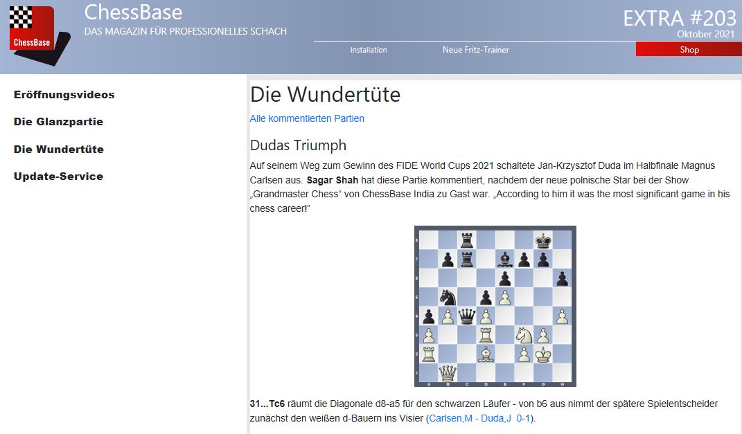 In der „Wundertüte“ erwarten Sie neben der Glanzpartie von Safarli 29 weitere ausführlich kommentierte Partien! Darunter sind Analysen von Romain Edouard, Michal Krasenkow, Sagar Shah, Spyridon Kapnisis und Tanmay Srinath. „Dudas Triumph“ – die Gewinnpartie des polnischen Superstars gegen Magnus Carlsen vom Tiebreak des World Cups 2021, liegt ganz oben auf, analysiert von Sagar Shah.