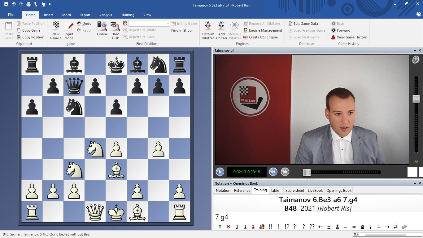 Das aggressive 7.g4 hat in diesem Jahr schon für einige Aufmerksamkeit gesorgt, u.a. war Anish Giri damit im März gegen Ian Nepomniachtchi erfolgreich. Der WM-Herausforderer reagierte auf den Vorstoß mit 7…h6, doch nach 8.h4 Sf6 9.Sxc6 bxc6 10.Df3 bekam Giri eine sehr komfortable Stellung. In seiner Analyse nimmt Robert Ris die kritische Fortsetzung 7…Sxd4 8.Dxd4 b5 9.0-0-0 Lb7 10.Kb1!? gründlich unter die Lupe. Videospielzeit: 38 Minuten!