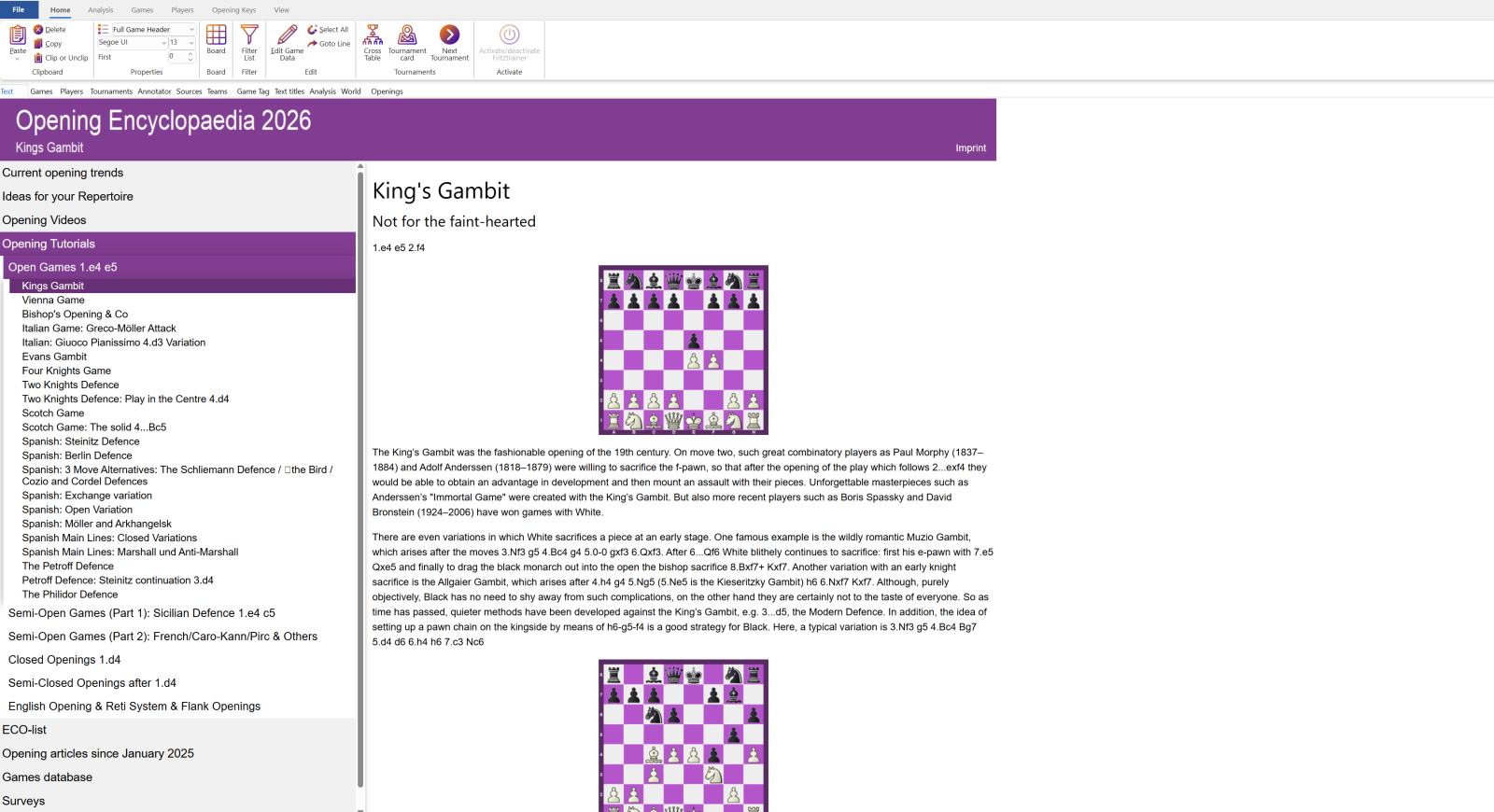 Mit dem ChessBase Eröffnungslexikon 2026 sind Sie bestens vorbereitet! Es bietet tiefgehende Informationen zu allen etablierten Eröffnungen und ist damit besonders wertvoll für den Aufbau eines lückenlosen und schlagkräftigen Repertoires. Das Eröffnungslexikon 2026 ist die vollständige Darstellung aller Eröffnungsgebiete in einem Lehrwerk und damit der optimale Einstieg in das Eröffnungstraining.