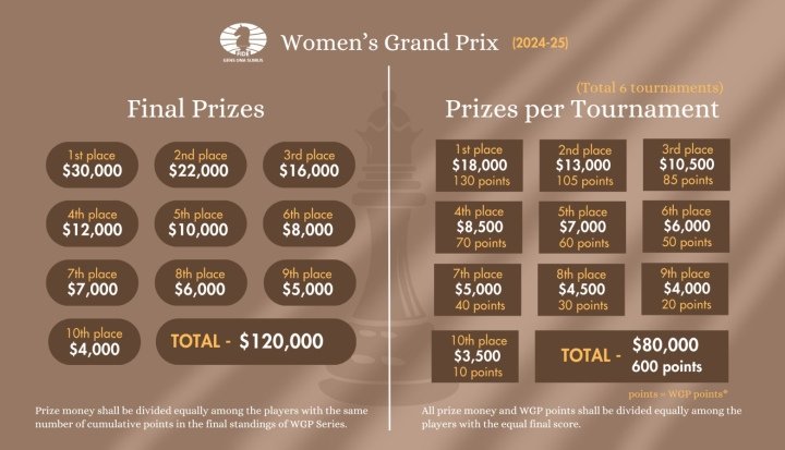 Anpassungen bei der Punktevergabe: Das allgemeine Punktesystem bleibt unverändert, aber aufgrund der Zunahme der Turniere und der Anpassungen an die Spielerbeteiligung wurden die pro Turnier vergebenen Punkte von 850 auf 600 Punkte gesenkt. Die beiden Spielerinnen mit den höchsten kumulierten Punkten in der WGP-Serie qualifizieren sich für das FIDE-Kandidatinnen-Turnier 2026.