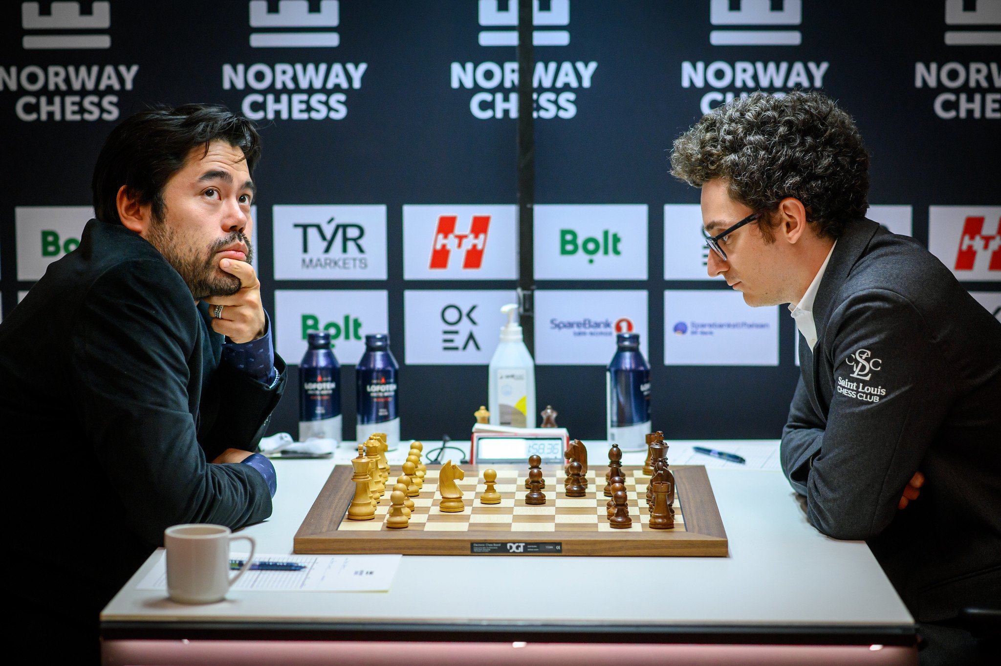 Hikaru Nakamura und Fabiano Caruana spielten ihre Partie auf dem Gelände der Sizilianischen Rossolimo-Variante. Schon bald nach der Eröffnung wurden die meisten Steine getauscht und die Partie verflachte zum Remis.