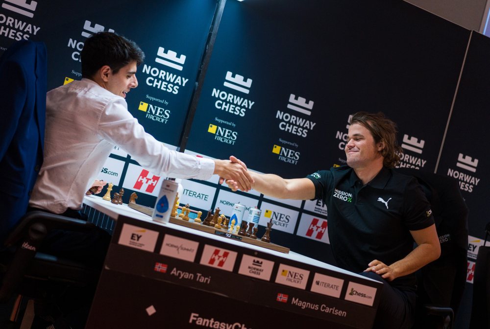 An den anderen Brettern hat man sich offenbar inzwischen gut an die Armageddon-Verlängerung gewöhnt. Magnus Carlsen spielte mit den schwarzen Steinen gegen seinen in Stavanger geborenen Landsmann Aryan Tari. Auf Carlsens Sizilianische Verteidigung mit 2...d6 reagierte Tari mit 3.Lb5, wonach später eine Maroczy-Stellung entstand. Carlsen konnte die Stellung mit 16...d5 öffnen und in der Folge kam es zu einigen Abtäuschen. Am Ende entstand ein Schwerfigurenendspiel mit Damen und Türmen, in dem keine Seite entscheidend in Vorteil kommen konnte. Das anschließende Armageddon entschied Carlsen für sich, indem er mit den schwarzen Steinen einen Angriff entfesselte, der in einem Matt gipfelte.