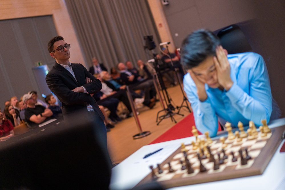 Alireza Firouzja und Hikaru Nakamura übten sich in einer ähnlichen Eröffnung, der Rossolimo-Variante und sorgten für Verblüffung, als sie beide gegen jede althergebrachte Regel verstießen und mit 7.Sa3 Sh6 ihre Springer an den Rand entwickelten. Dort blieben sie aber natürlich nicht. Es entwickelte sich eine interessante positionelle Partie, die aber keinen Sieger fand. Im Armageddon kam es im Endspiel zu einer interessanten Konstellation mit zwei schwarzen Türmen von Nakamura gegen drei weiße Leichtfiguren von Firouzja. Die Türme erwiesen sich als besser und der halbe Extrapunkt ging an Nakamura.