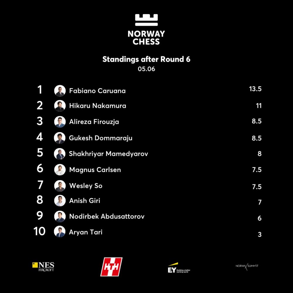 Fabiano Caruana ist der dominierende Spieler beim 11. Norway Chess Turnier in Stavanger. In der sechsten Runde gelang dem US-Großmeister und Vizeweltmeister von 2018 ein weiterer Sieg in der klassischen Partie, der hier mit drei Punkten gewertet wird. Sein unterlegener Gegner war diesmal Nodirbek Abdusattorov. Die Partie begann mit der Italienischen Modeeröffnung und verlief sehr lange ausgeglichen. Dann gingen beide Seiten ins Risiko am Königsflügel und in einem Damenendspiel mit Leichtfiguren hatte Caruana das bessere Ende für sich.