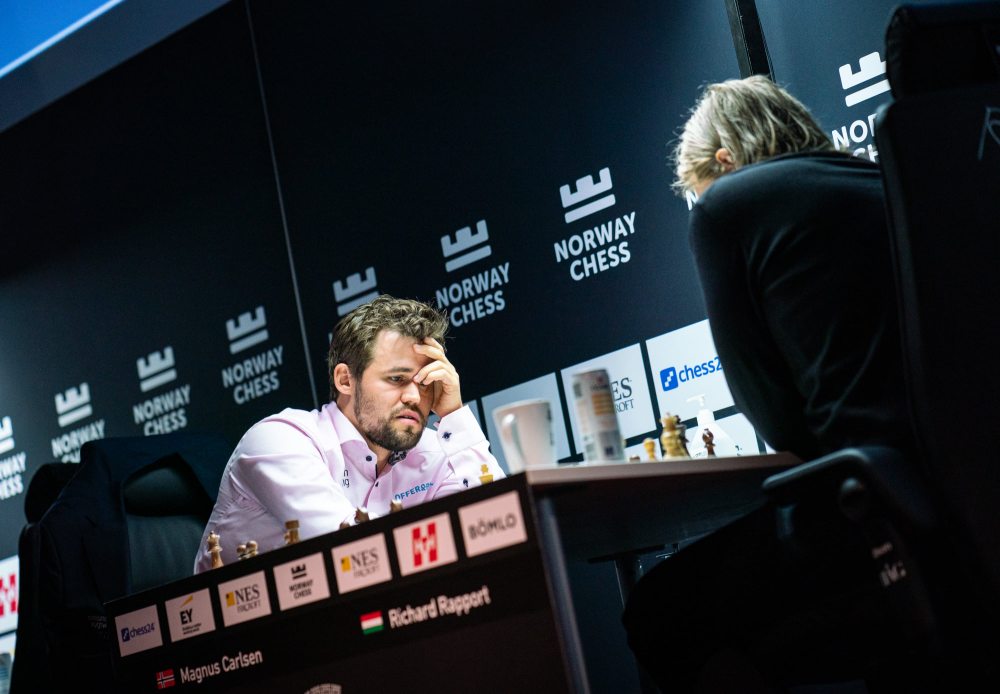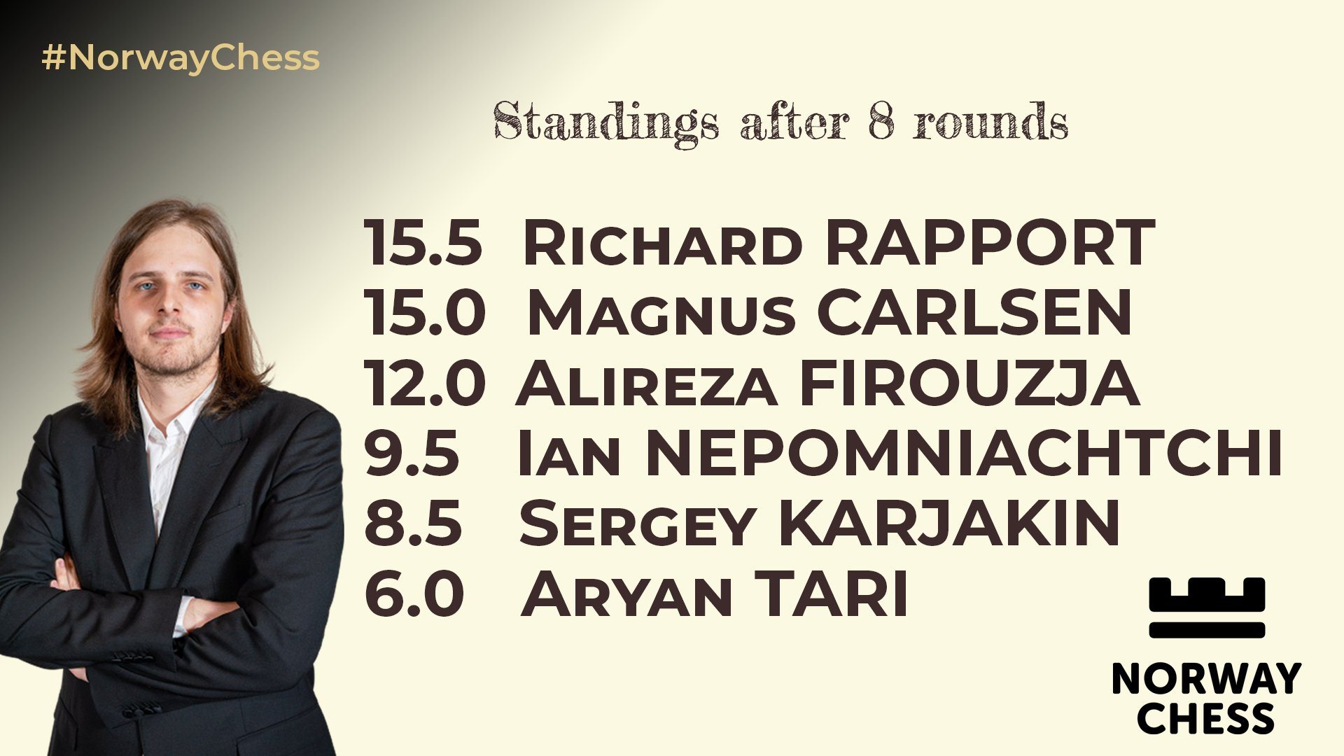 Richard Rapport führte nach der 7. Runden mit 15,5 Punkten und dreieinhalb Punkten Vorsprung vor Magnus Carlsen, der sich mit seinem Sieg über Alireza Firouzja saniert hatte. Dreieinhalb Punkte ist in einer normalen Schachtabelle ein riesiger Vorsprung, hier nicht. Carlsen war praktisch auf Schlagdistanz am Tabellenführer dran. Und hatte es selber in der Hand, den Vorsprung weiter zu verkürzen, denn in Runde acht kam es zum Spitzenspiel zwischen den temperamentvollen und taktisch stets originell spielenden Ungarn und seinem Verfolger.