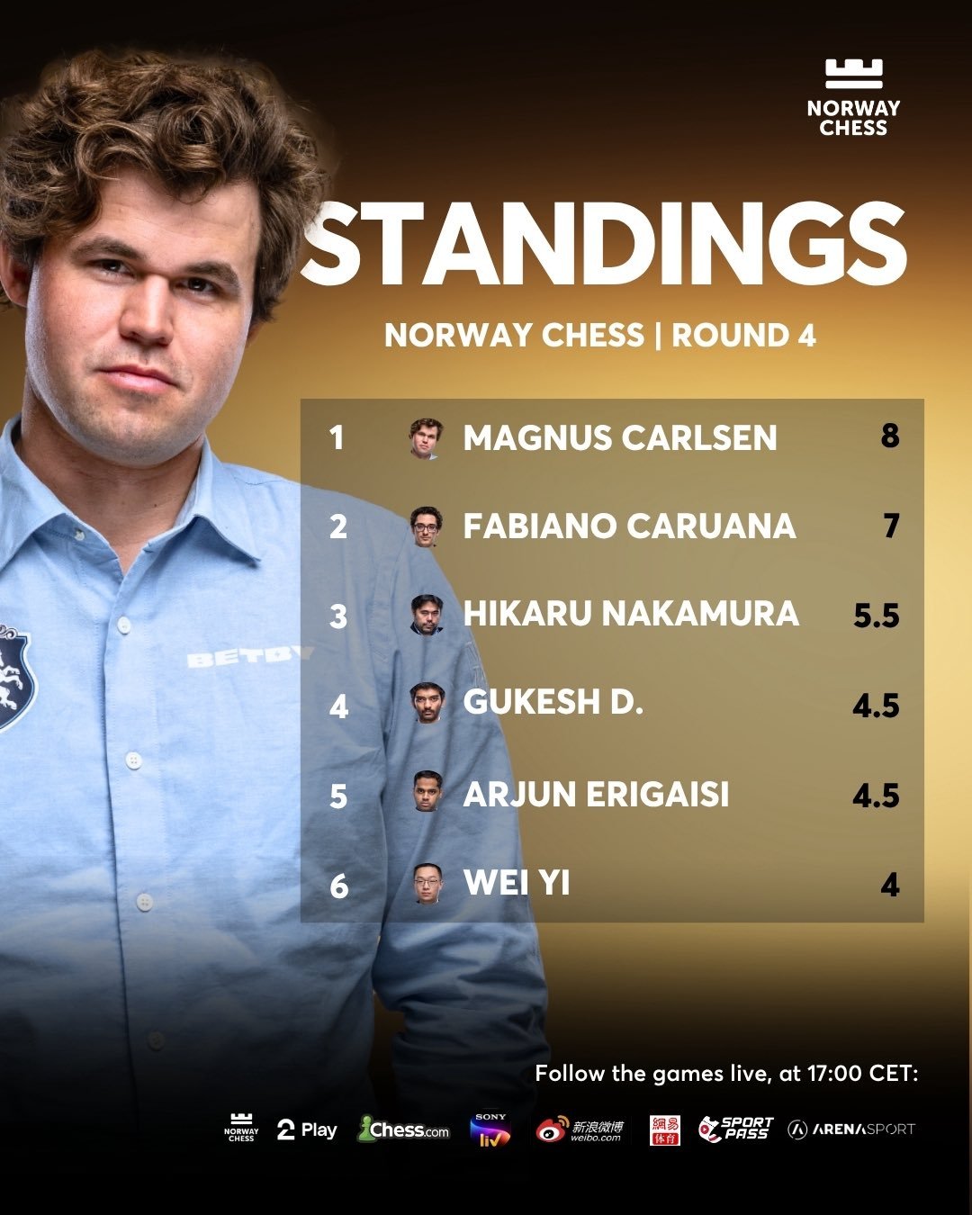 Die vierte Runde wurde am 29. Mai gespielt - für Gukesh ein besonderer Tag, denn es ist sein Geburtstag. Geboren wurde er 2006, feierte also diesmal seinen 19. Geburtstag. Der Weltmeister erhielt reichlich Glückwünsche und wurde von der indischen Gemeinde gefeiert, die auch in Norwegen groß zu sein scheint.