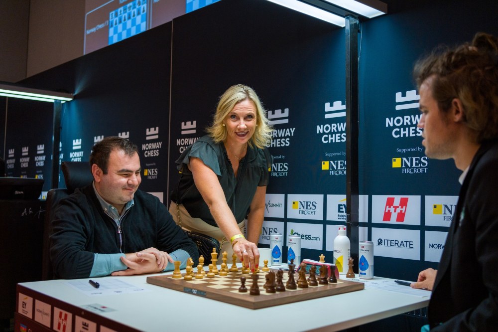 Helen Totland, CEO von Ernst & Young Norwegen eröffnete die Partie am Brett von Mamedyarov und Carlsen.