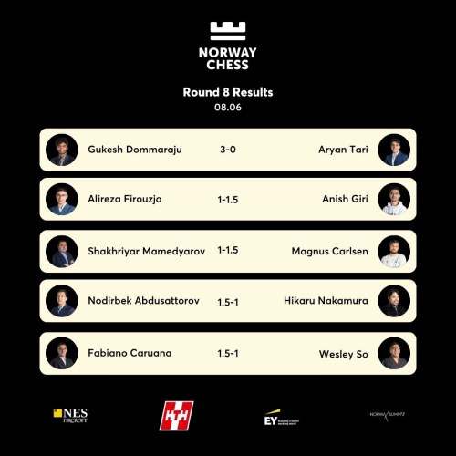 Nodirbek Abdusattorov und Hikaru Nakamura übten sich in der Spanischen Berliner Verteidigung mit etwa anderen Stellungsbildern als den üblichen. Irgendwann waren die Positionen aber doch festgefahren und die Partie endete ohne Sieger. Im Armageddon wurde die Eröffnung wiederholt, aber diesmal gelang es dem Usbeken die Berliner Mauer des US-Amerikaners zu einzureißen.