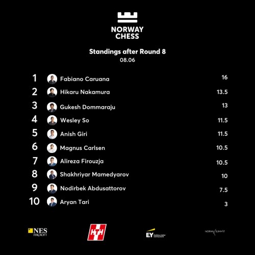 Auch das 11. Norway Chess Turnier in Stavanger ist nun bald Geschichte. Am Donnerstag wurde die achte und vorletzte Runde gespielt und die Weichen für den Turnierausgang gestellt. Am Freitag entscheidet sich dann in einer Art Finalpartie, wer als Turniersieger aus Stavanger abreist. Den besten Eindruck in dieser langen Turnierwoche hinterließ Fabiano Caruana, der die meisten der klassischen Partien gewann und das Feld fast die ganze Zeit anführte. Einzig Hikaru Nakamura kann seinen Landsmann noch einholen. Das Los, genauer: die Platzierung im vorangestellten Blitzturnier, wollte es, dass die beiden Führenden es in der letzten Runde im Vergleich Mann gegen Mann untereinander ausmachen können. Wenn Hikaru Nakamura Fabiano Caruana in der letzten Runde in der klassischen Partie schlägt, ist er der Turniersieger.