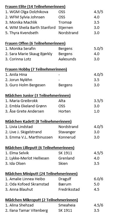 Nach fast 40 Jahren Pause war im vergangenen Jahr in Norwegen wieder eine Frauenmeisterschaft ausgetragen worden. In diesem Jahr wurde das Turnier mit der jährlich stattfindenden Meisterschaft der Mädchen zusammengelegt und fand vom 28.2.-1.3. in Bergen statt. Der Norwegische Schachverband war wirklich daran interessiert, diesen Wettkampf aufzuwerten. So bekam der Sieger der Elite-Klasse einen Platz bei der Blitz- und Schnellschachmeisterschaft der Frauen. Mit dem Verein Søråshøgda in Bergen wurde zudem ein ausgezeichneter Veranstalter für das größte Turnier Norwegens mit rein weiblicher Beteiligung gefunden.
