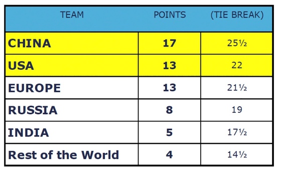 Die chinesische Mannschaft hatte von vornherein einen gewissen Vorteil gehabt, weil sie am Frauenbrett mit Hou Yifan (Nummer 1 der Weltrangliste) und Ju Wenjun (amtierende Weltmeisterin) glänzend besetzt war. Die beiden Damen holten gemeinsam auch immerhin 8 Punkte aus den 11 Partien, wobei sie ohne jede Niederlage blieben.