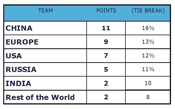 Das Team Europa gewann 2½:1½ gegen den "Rest der Welt", wobei unter anderem der Sieg von Levon Aronian gegen Alireza Firouzja entscheidende Bedeutung hatte.