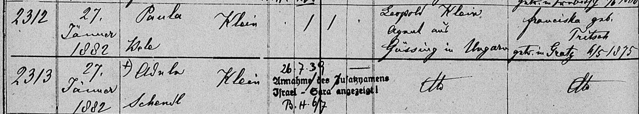 27. Januar 1882: Geburt von Paula Bele Klein und ihrer Schwester Adela Schendl Klein in Wien.