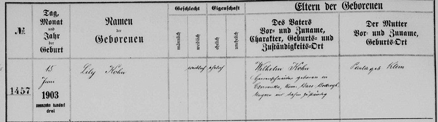 Vater: Wilhelm Kohn, geboren in Cservenka (Bács Bodrog); Mutter: Paula, geborene Klein.