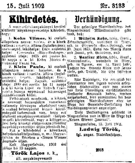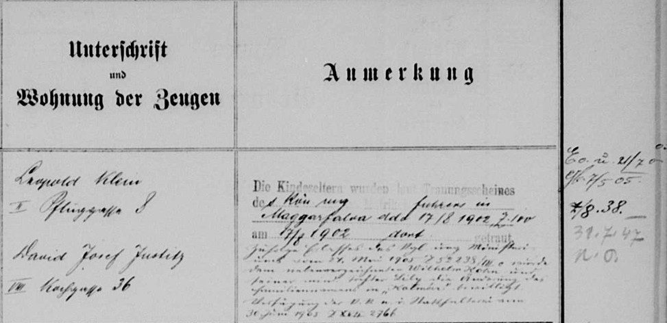 Die Anmerkungen (Anmerkung) zeigen Magyarfalva und 17/8 1902, möglicherweise ihr Heiratsdatum.